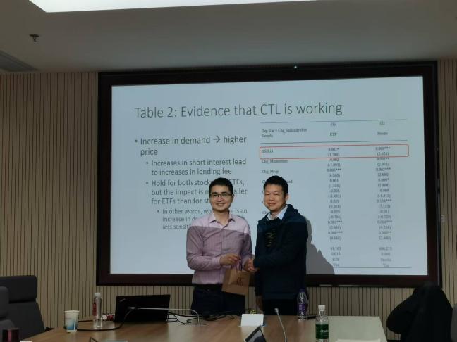 赵武阳教授报告的题目为“ETF贷款市场:ETF市场高额贷款费用的原因与经济后果分析(ETF Loan Market:Causes and Consequences of High ETFs Lending Fees)”。他基于自己历时四年完成的一篇文章与我们做了分享,文章发现ETF的贷款费用明显高于单只股票,这一结果的主要原因是在ETF创设-出借过程(CTL)中成本高昂且存在许多阻碍因素,并最终导致股票借贷市场中缺乏竞争,为相关研究提供了研究方向和思路。最后,赵教授分享了在高水平国际期刊发表论文的经验,指出好的研究思想、精密的研究设计与优秀的合作者,以及良好的运气是论文最终是否发表的关键因素。