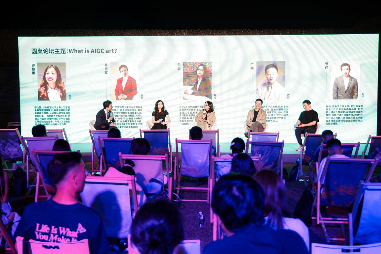 跨学科圆桌论坛围绕“什么是AIGC艺术?”展开,邵怡蕾、吴冠军、毛尖、严锋、张伟、王玥婷作为论坛嘉宾,就AI艺术的定义、价值和未来发展趋势进行了深入的探讨。邵怡蕾指出,艺术为科技注入了灵魂,让算法和数据变得有温度、有情感,AIGC给予了无限可能性。吴冠军阐释了AI如何帮助艺术家突破传统创作的局限,实现更加大胆和创新的艺术表达。严锋表示,AIGC具有作者性,不断改变人们对艺术创作认知的同时,也需要人类的共同合作。毛尖从电影艺术视角提出,AI的创作不受传统艺术规则的限制,可以创造出独特的艺术风格,具有很高的创新性。张伟提出,AIGC本质是人的作品,艺术是人的主动创作的结果,AI艺术的边界应以人的参与为评判标准。在AI涌现的时代,王玥婷表示艺术创作的过程尤为关键。