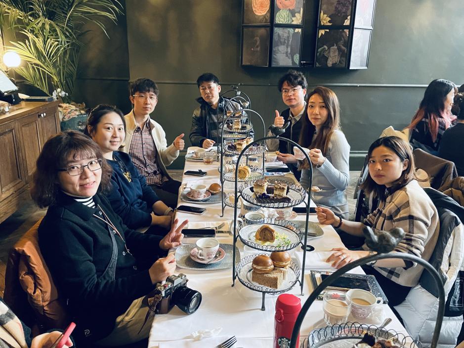 1月20日,在温馨的午后,利兹访学师生在主办方的安排下,团队齐聚一堂,在Lost&Found Club开启英式下午茶时光。精致点心、醇香红茶,优雅氛围弥漫。欢声笑语中,拉近彼此距离,留下难忘美好时光。精美的三层点心塔摆满了香甜的司康、细腻的蛋糕和可口的三明治,搭配上冒着热气的正统红茶。阳光透过窗户洒在桌上,大家轻抿茶香,细品美食,轻声交谈着工作与生活趣事。银质餐具碰撞发出清脆声响,为这悠闲时刻增添几分雅致。此刻,压力消散,团队情谊在茶香与笑语中悄然升温,每一口都满是温馨与惬意,成为繁忙工作中珍贵的美好记忆。