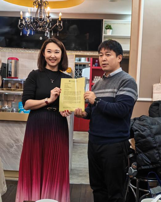 茶话会结束后,利兹大学的Ellen Wang女士亲自带领访学团成员前往“家”餐厅(Home Chinese Restaurant),共度小年夜晚餐。晚餐伊始,Ellen Wang表达了对本次访学项目的高度认可,并特别提到对来自中国的参访人员的亲切感。贾老师也代表同学们向利兹大学商学院的周到安排表示衷心的感谢,并赠送出学院方的官方感谢信,和学生们手绘和启笔的函件。在品尝中国美食的过程中,同学们的友谊与师生情谊进一步升温,整个晚餐现场洋溢着欢乐与温暖的氛围。