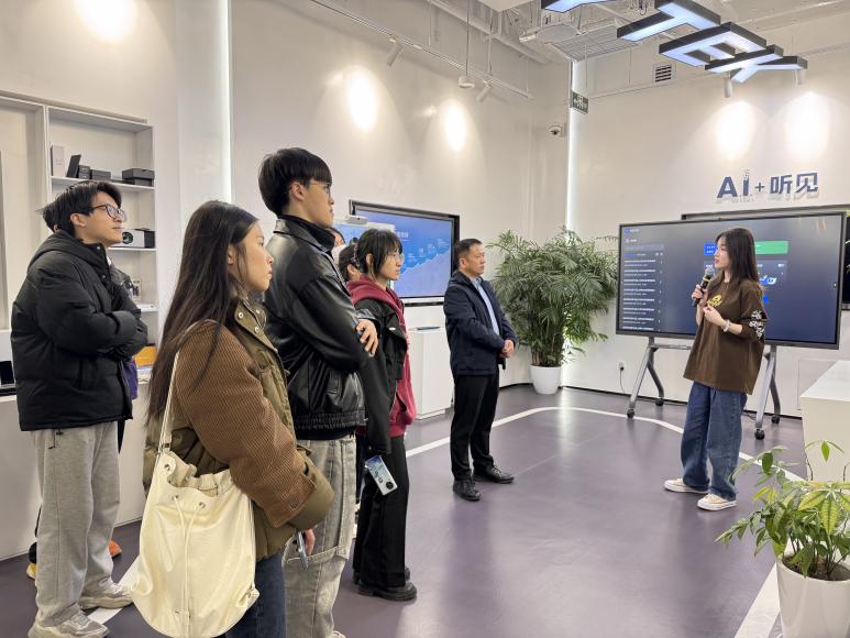 师生一行首先在科大讯飞上海公司大客户总监赵望淙的带领下参观了人工智能体验馆。通过工作人员生动细致的介绍,师生们深入了解了科大讯飞自1999年至今的成长历程以及企业发展的重要里程碑。在“AI+听见”、“AI+教育”、“AI+医疗”、“AI+政府”等主题展区,师生们沉浸式体验了人工智能技术在不同领域的创新应用,切身感受科技带来的无限可能。