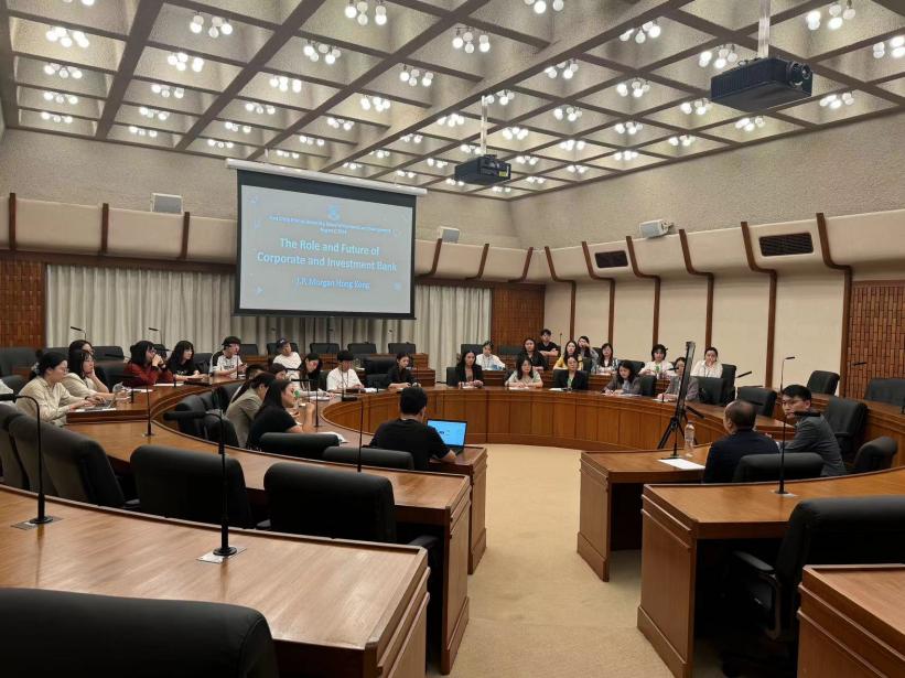 傍晚,香港大学主办方邀请香港前沿金融机构摩根大通的高管Andy及分析员Kevin,为研学师生做分享,主题为金融企业和投资银行在行业中扮演的角色和对未来发展的展望。
