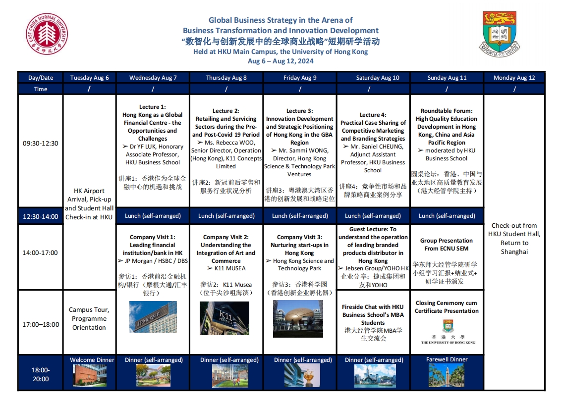 »具体安排为:2024年8月6日(周二)抵达香港国际机场,前往香港大学、入住港大学生公寓(单人间);8月7日(周三)至8月11日(周日)在香港大学主校区进行课程学习、企业参访、圆桌论坛、学生座谈交流、研学汇报等活动;8月12日(周一)返回上海。